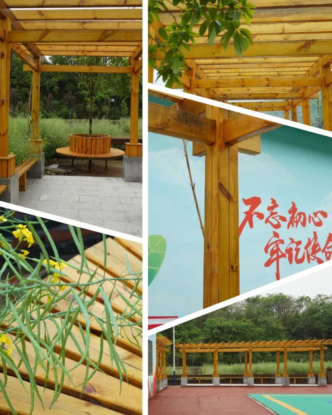將農(nóng)具鑲嵌在墻上村民休憩的長廊與涼亭