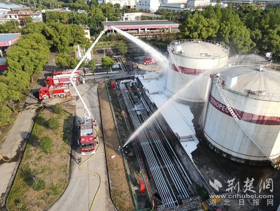 此次拉動演練設定西塞山油庫一罐體由于施工滲漏導致圍堰內形成流淌火,情況危急。災情發(fā)生后,企業(yè)立即啟動應急預案,并撥打119報警。市消防救援支隊按照輕型化工滅火救援編隊編成,立即出動通信指揮、舉高噴射、滅火冷卻、戰(zhàn)勤保障4個作戰(zhàn)單元,總計16車50人。運用防火堤池火撲救戰(zhàn)術,進行“三梯次三疊加”泡沫覆蓋,實現(xiàn)低、中、高倍數(shù)泡沫疊加覆蓋。