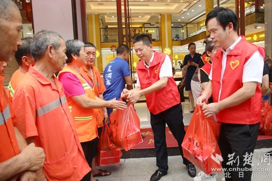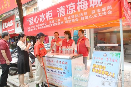 荊楚網(wǎng)(湖北日?qǐng)?bào)網(wǎng))訊(通訊員 曹競(jìng)帆 張萍)“這個(gè)愛(ài)心大禮包太實(shí)用了。”7月19日,在黃梅縣“愛(ài)心冰柜 清涼梅城”新時(shí)代文明實(shí)踐志愿服務(wù)活動(dòng)啟動(dòng)儀式上,拿到裝有水果罐頭、綠豆的防暑降溫禮包后,該縣黃梅鎮(zhèn)環(huán)衛(wèi)工人吳大姐微笑著豎起大拇指,“有了這些‘愛(ài)心冰柜’,我和工友們以后補(bǔ)水就很方便了!”