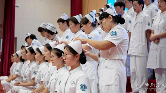 在激昂的黃岡市中心醫(yī)院院歌中,專家前輩和護(hù)士長(zhǎng)代表為新職工們佩戴聽診器和燕尾帽,并一起重溫了中國(guó)醫(yī)師宣言和南丁格爾誓詞。新職工們肅然站立、莊嚴(yán)宣誓,鏗鏘有力的誓言久久回蕩。一張張青春洋溢的臉龐,一聲聲莊嚴(yán)的承諾,都詮釋著投身醫(yī)療事業(yè)的無限榮光。