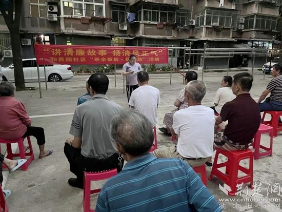 傍晚時分,身處湖濱花園小區(qū)的“和悠然 慢生活”休閑廣場,第二黨支部書記呂培根分享了《留得清氣滿乾坤》廉潔故事匯中的周恩來廉潔自律的故事。他勸誡領導干部們,要想成功度過思想、政治、社會、親屬和生活的五道關口,就必須堅守共產黨員的政治操守和優(yōu)良作風。
