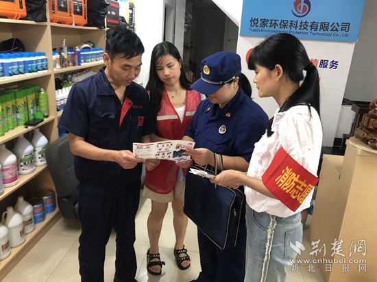 在西塞山區(qū),消防人員走進沿街門面開展消防安全檢查宣傳?!疤鞖庋谉?,用電量劇增,請不要私拉亂接線路、超負荷用電,要經(jīng)常檢查線路敷設(shè)是否完好。”消防人員一邊檢查,一邊提醒商戶要經(jīng)常開展消防隱患自查自改,同時要熟練掌握滅火器、消火栓等器材使用方法。下陸區(qū)消防救援大隊結(jié)合夏季高溫防火特點,整合戶外大屏、社會單位LED屏幕等社會資源循環(huán)播放夏季防火提示公告、高溫防火提示,提醒廣大人民群眾規(guī)范用火、用氣、用電。