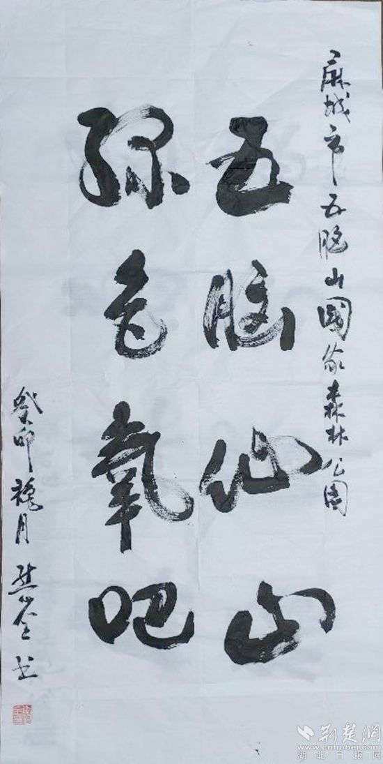 最后,由麻城市楹聯(lián)協(xié)會副會長、書法協(xié)會理事熊心全現(xiàn)場揮毫題字。