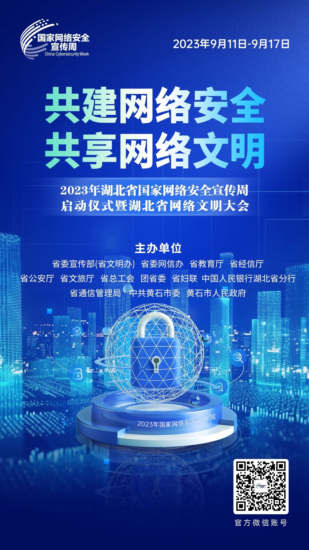 2023年湖北省國家網(wǎng)絡(luò)安全宣傳周暨湖北省網(wǎng)絡(luò)文明大會由省委宣傳部(省文明辦)、省委網(wǎng)信辦、省教育廳、省經(jīng)信廳、省公安廳、省文旅廳、省總工會、團省委、省婦聯(lián)、中國人民銀行湖北省分行、省通信管理局、中共黃石市委、黃石市人民政府共同主辦。