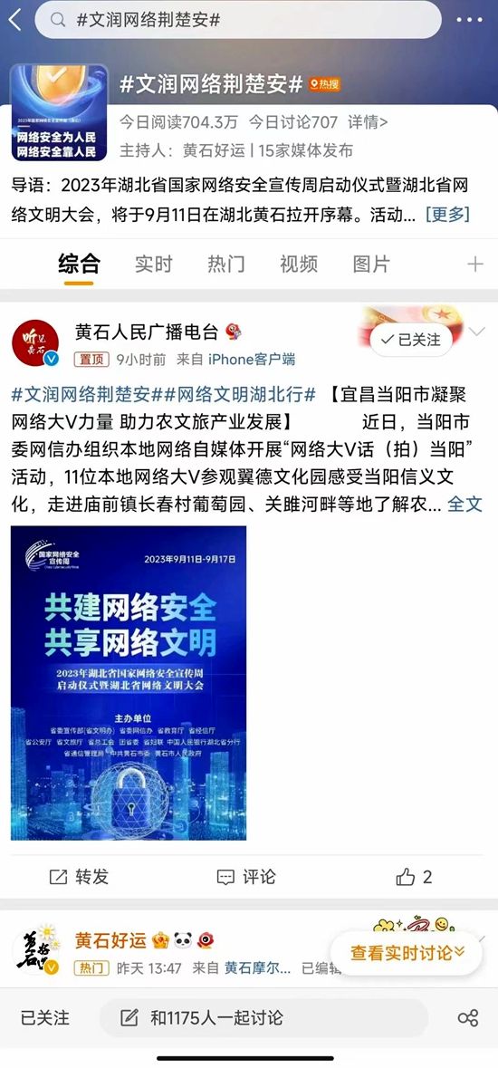 荊楚網(wǎng)(湖北日?qǐng)?bào)網(wǎng))訊(記者 呂鑒蕾 通訊員 黃旺宣)2023年湖北省國家網(wǎng)絡(luò)安全宣傳周啟動(dòng)儀式暨湖北省網(wǎng)絡(luò)文明大會(huì)開幕在即。連日來,圍繞“文潤(rùn)網(wǎng)絡(luò)荊楚安”“網(wǎng)絡(luò)文明湖北行”等話題,社交平臺(tái)上開啟了“湖北接力”。