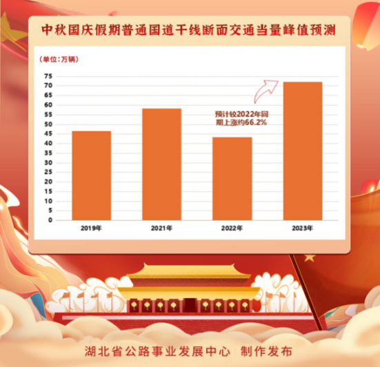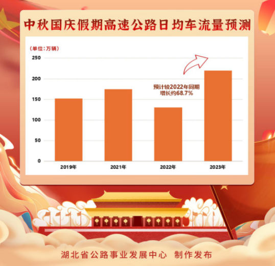 湖北省公路事業(yè)發(fā)展中心通過分析歷年公路網(wǎng)運(yùn)行數(shù)據(jù),對比近年來中秋國慶期間天氣、車流量等情況,結(jié)合近期全省路網(wǎng)運(yùn)行實(shí)際,預(yù)計節(jié)日期間高速路網(wǎng)通行車輛流量較近期平日日均流量增長約100%,較2022年同期日均流量增長約68.7%。