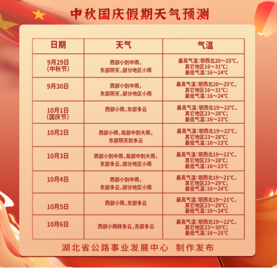 經(jīng)氣象部門研判,預(yù)計2023年中秋國慶期間(9月29日至10月6日),湖北省有兩次降水及弱降溫過程,分別出現(xiàn)在9月29—30日及10月2—4日,其它時段西部以陰雨為主,東部以多云為主;10月6日早晨部分路段可能有大霧。鑒于西部地區(qū)前期降水偏多,中秋國慶假期仍以陰雨為主,西部地區(qū)需加強(qiáng)防范邊坡滑坡等地質(zhì)災(zāi)害及降雨造成的低能見度對交通安全的影響,東部地區(qū)需關(guān)注6日早晨可能出現(xiàn)大霧天氣。具體預(yù)報如下: