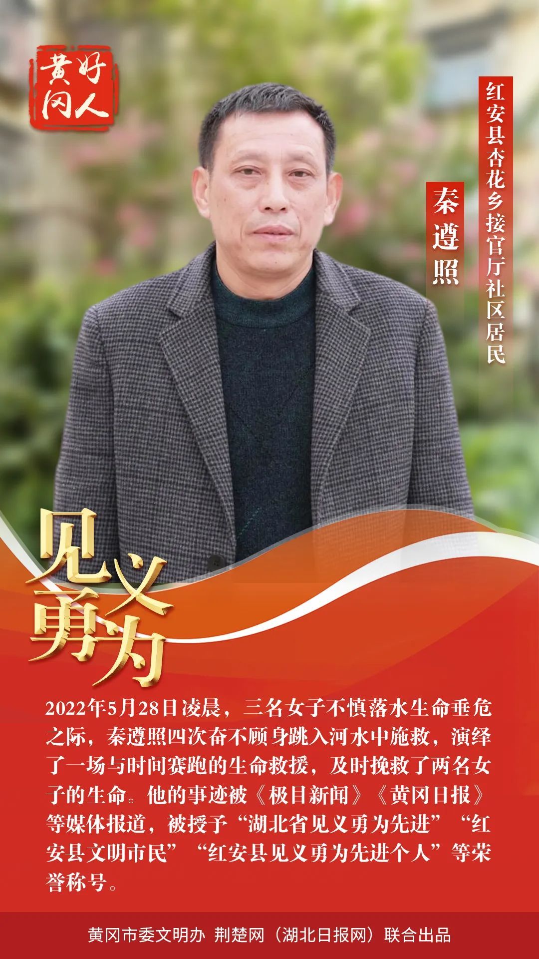本期“黃岡好人”共有5組好人入選。他們中,有“見義勇為,勇救落水者”的秦遵照;有“扎根基層七十余載老醫(yī)”的張自強;有“孝老愛親,待叔如父,被譽為大山里‘好兒媳’”的丁衛(wèi)香;有“助人為樂,從事志愿服務30余年的”的汪天明;有“助人為樂,創(chuàng)建了‘向陽花’留守兒童之家品牌”的張靜。