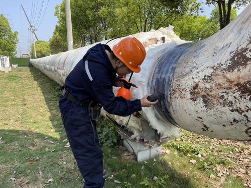 檢驗現(xiàn)場,宜昌分院兵分三組進行檢驗,對壓力管道的標(biāo)志、組成件及焊縫、管道支撐件、排放裝置、防腐層及隔熱層外觀情況進行了檢驗,查看了安全閥和壓力表是否在損壞情況,還按要求對重點部位進行了壁厚測量、金相分析、無損檢測。因準(zhǔn)備充分,檢驗人員當(dāng)天便完成了全線管道現(xiàn)場檢驗任務(wù),獲得企業(yè)點贊。