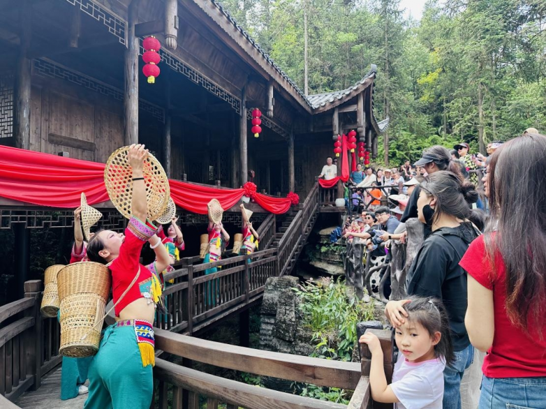 熱情洋溢的迎客攔門酒,大型情景劇《戀上梭布埡 愛在女兒會》讓遠道而來的游客感受到了土家兒女熱情好客的情誼和豐富多彩的民俗文化。