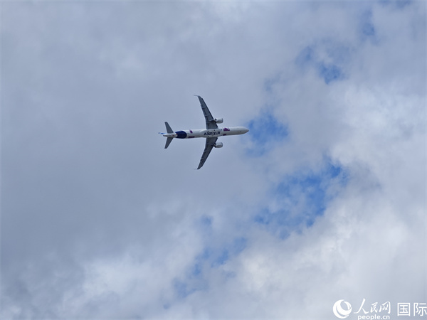 正在航展上進行飛行表演的空客A321型客機。人民網(wǎng)記者 邢雪攝