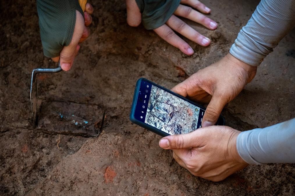 “好像是銅!”——臨近傍晚時分,考古工地上突然沸騰起來。耶魯-新加坡國立大學學院學生李拔漢發(fā)出驚嘆,求教武漢大學歷史學院的助教老師進一步確認自己的新發(fā)現(xiàn)。考古學員輕輕撥開細軟的泥土,竟然是一枚清晰可辨的銅箭鏃。經(jīng)過拍照記錄,隨后這件新發(fā)現(xiàn)被整體揭取下來,拿回文物陳列室待做進一步保護與分析。