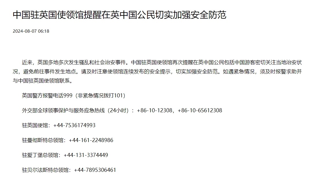 央視網(wǎng)消息:中國駐英國使領(lǐng)館8月7日發(fā)布重要通知,提醒在英中國公民包括中國游客切實加強(qiáng)安全防范。近來,英國多地多次發(fā)生騷亂和社會治安事件。中國駐英國使領(lǐng)館再次提醒在英中國公民包括中國游客密切關(guān)注當(dāng)?shù)刂伟矤顩r,避免前往事件發(fā)生地點。請及時注意使領(lǐng)館連續(xù)發(fā)布的安全提示,切實加強(qiáng)安全防范。如遇緊急情況,須及時報警求助并與中國駐英國使領(lǐng)館聯(lián)系。