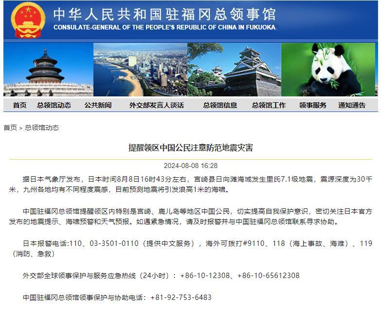 中國駐福岡總領(lǐng)館提醒領(lǐng)區(qū)內(nèi)特別是宮崎、鹿兒島等地區(qū)中國公民,切實(shí)提高自我保護(hù)意識,密切關(guān)注日本官方發(fā)布的地震提示、海嘯預(yù)警和天氣預(yù)報(bào)。如遇緊急情況,請及時(shí)報(bào)警并與中國駐福岡總領(lǐng)館聯(lián)系尋求協(xié)助。