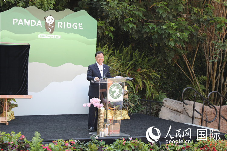 當?shù)貢r間8月8日,美國加利福尼亞州圣迭戈動物園舉行大熊貓新館開館儀式。中國駐美大使謝鋒發(fā)表致辭。人民網(wǎng)記者 李志偉攝