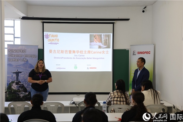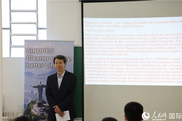 人民網里約熱內盧8月14日電 (記者陳海琪)當地時間8月14日,由中國石化集團中南美代表處和里約天主教大學孔子學院聯(lián)合舉辦的漢語培訓班開課儀式在里約曼吉尼奧斯芭蕾舞學校舉行。中國石化集團中南美代表處總代表、國勘巴西公司總經理張連華,里約天主教大學孔子學院中方院長孫艷萍,里約曼吉尼奧斯芭蕾舞學校校長卡琳出席儀式并致辭。