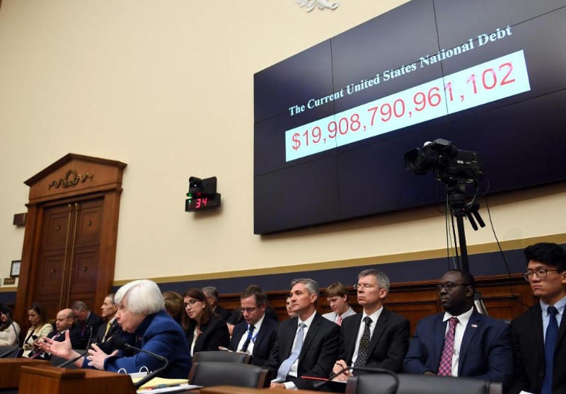 2017年7月12日,時任美國聯(lián)邦儲備委員會主席耶倫(前)在華盛頓出席國會聽證會,屏幕顯示美國當時的國債近20萬億美元。新華社記者殷博古攝