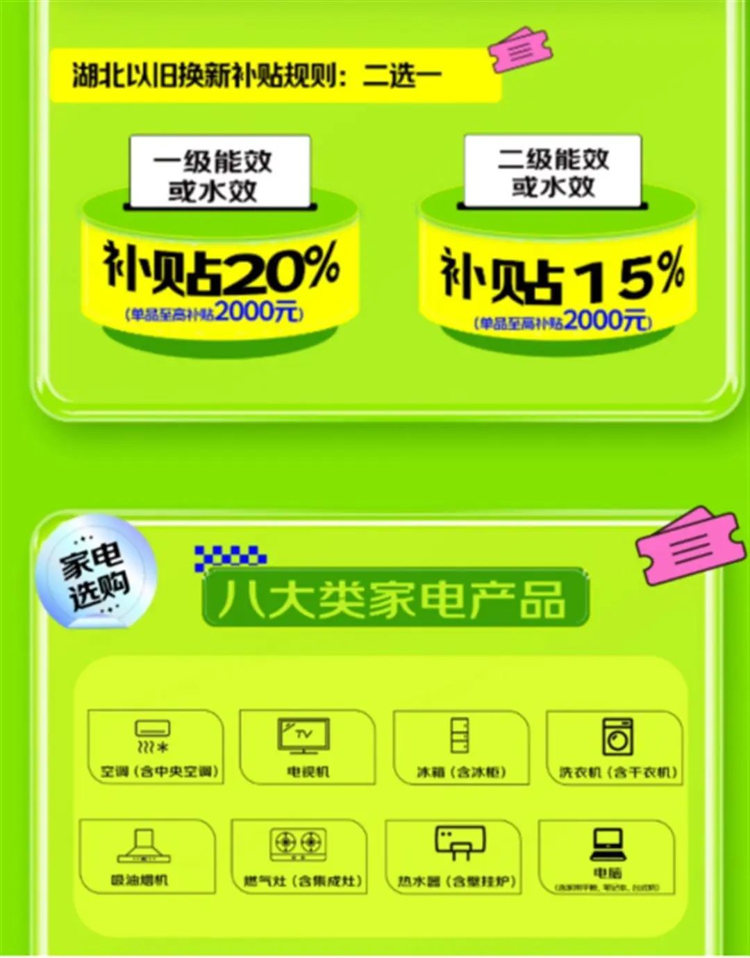 依據(jù)國家發(fā)展改革委、財(cái)政部7月25日發(fā)布的《關(guān)于加力支持大規(guī)模設(shè)備更新和消費(fèi)品以舊換新的若干措施》,湖北省商務(wù)廳自即日起至12月31日,開展家電以舊換新活動(dòng)。此次活動(dòng)覆蓋空調(diào)、冰箱、洗衣機(jī)、電視機(jī)、吸油煙機(jī)、燃?xì)庠睢崴?、電腦等八大類產(chǎn)品,一級(jí)能效/水效家電享受20%的補(bǔ)貼,二級(jí)能效/水效家電享受15%的補(bǔ)貼。