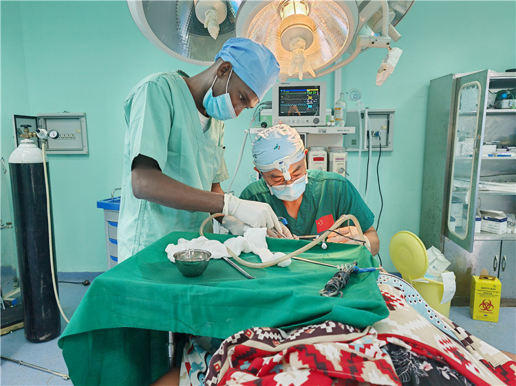 李廣醫(yī)生與當(dāng)?shù)蒯t(yī)生在做手術(shù)中。中國(guó)援桑醫(yī)療隊(duì)供圖