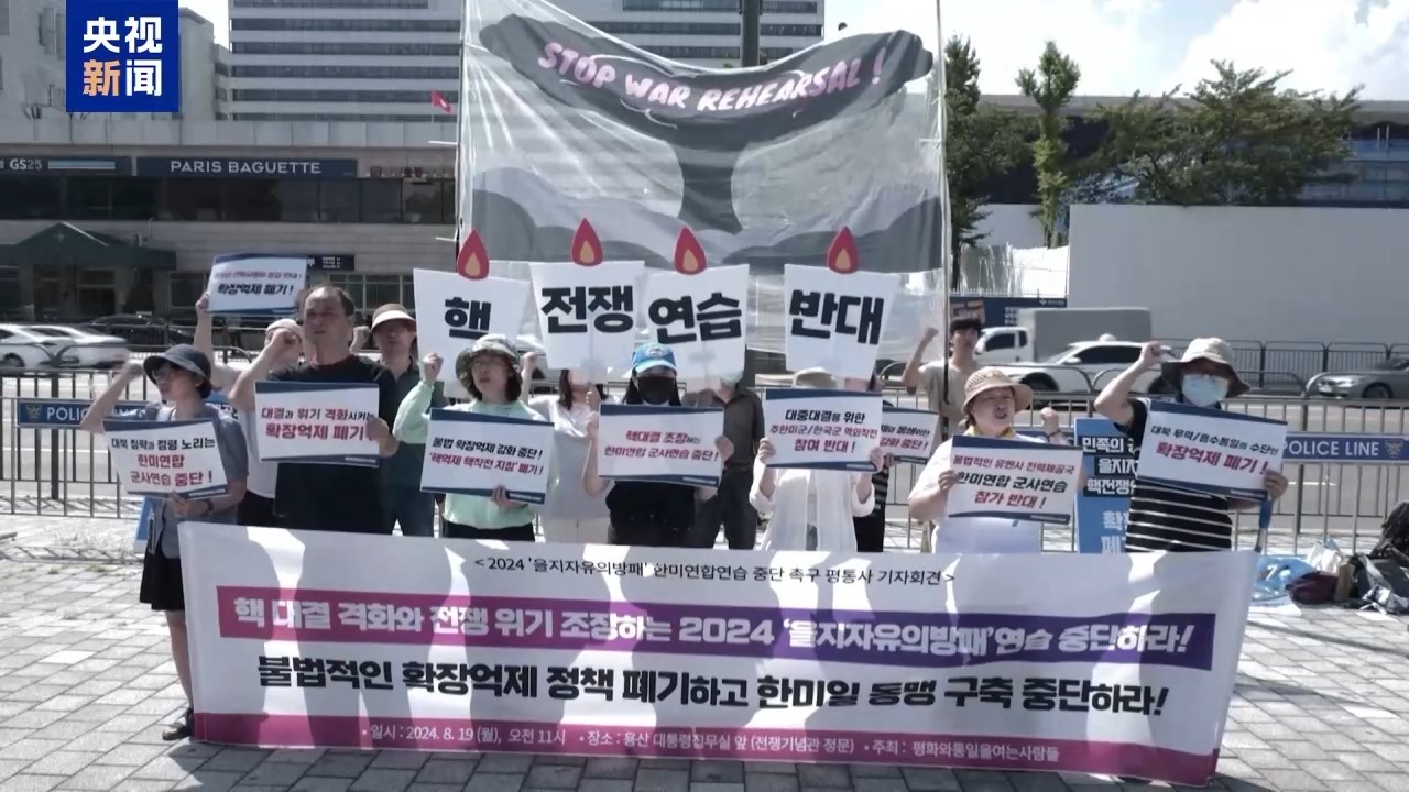 韓國民間團體負責人:這次“乙支自由之盾”演習(xí)將使朝鮮半島和東北亞的核對抗和戰(zhàn)爭升級。核對抗的最終結(jié)果將導(dǎo)致整個民族的毀滅,我們聚集在這里,呼吁停止“乙支自由之盾”演習(xí),該演習(xí)助長了核對抗和戰(zhàn)爭。