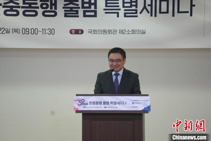 圖為中國(guó)駐韓國(guó)大使館臨時(shí)代辦方坤在成立儀式上致辭。中新社記者 劉旭 攝