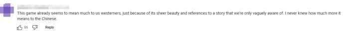 還有人感嘆,“僅憑借純粹的美感和一些我們不太了解的故事背景,這款游戲就已經(jīng)讓我們西方人覺得很有意義了。我之前并不知道,它對(duì)中國人意味著更多?!?/p>