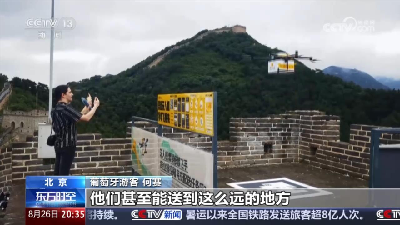 北京八達(dá)嶺長(zhǎng)城近期開通了無人機(jī)送外賣服務(wù),最快五分鐘,來自山下的酸梅湯、雪糕、創(chuàng)可貼等商品就能送到長(zhǎng)城上來。記者來到長(zhǎng)城這天,小雨淅淅瀝瀝。在南九城樓的一處無人機(jī)送餐點(diǎn),一位外國(guó)游客正在和中國(guó)朋友嘗試用外賣送一把雨傘。