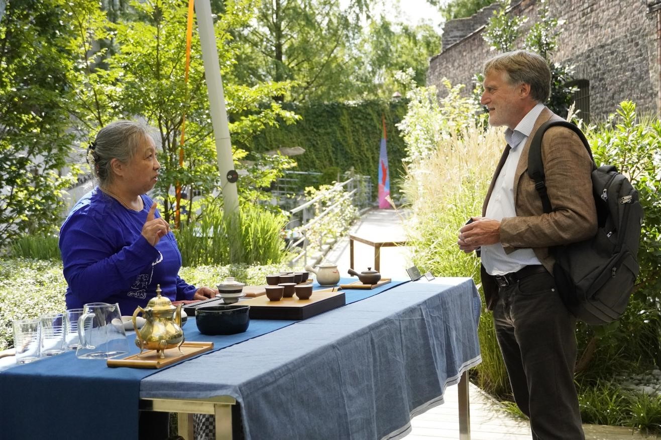 來(lái)賓在博物館的戶外花園品味中國(guó)茶藝。比利時(shí)維他命文化傳媒供圖