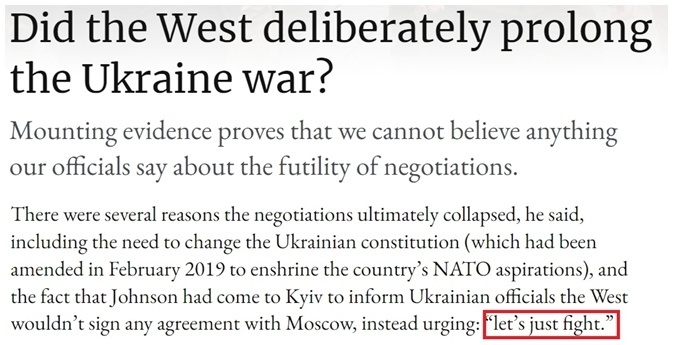 盡管談判失敗還有其他原因,但西方對烏克蘭做出的所謂“援助承諾”以及對烏克蘭“繼續(xù)戰(zhàn)斗”的鼓勵,無疑削弱了烏方與俄達(dá)成和平協(xié)議的意愿。