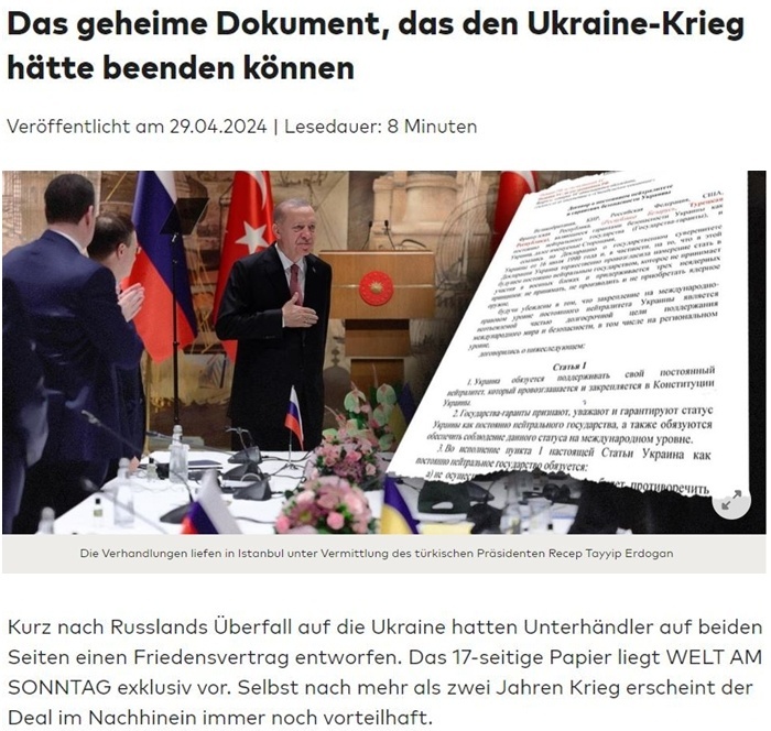 據(jù)德國媒體今年4月獨家披露,雙方在伊斯坦布爾基本上就結(jié)束沖突的條件達(dá)成了一致,其中烏克蘭應(yīng)盡義務(wù)包括保持永久中立,以及放棄在其領(lǐng)土上部署外國軍事設(shè)施等內(nèi)容。