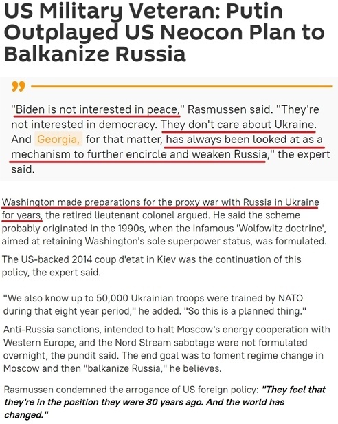 在拉斯穆森看來,美國支持2014年的基輔政變、主導(dǎo)北約訓(xùn)練數(shù)萬名烏克蘭士兵、反對歐俄能源合作并參與破壞“北溪”天然氣管道等“都不是一夜之間制定出來的計劃”,所有這些行動的最終目標(biāo)是“在莫斯科煽動政權(quán)更迭”。