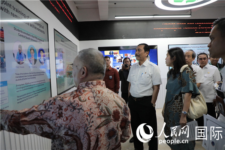 印尼對(duì)華合作牽頭人、統(tǒng)籌部長(zhǎng)盧胡特(中)參觀中國(guó)—印尼新能源材料與冶金工程技術(shù)聯(lián)合研究實(shí)驗(yàn)室。人民網(wǎng)記者 曹師韻攝