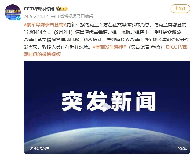 據(jù)烏克蘭軍方在社交媒體發(fā)布消息,烏克蘭首都基輔當(dāng)?shù)貢r(shí)間今天(9月2日)清晨遭俄軍彈道導(dǎo)彈、巡航導(dǎo)彈襲擊,呼吁民眾避險(xiǎn)?;o市緊急情況管理部門稱,初步估計(jì),導(dǎo)彈碎片致基輔市四個(gè)地區(qū)建筑受損并引發(fā)火災(zāi),救援人員正在趕往現(xiàn)場(chǎng)。(總臺(tái)記者 董薇)