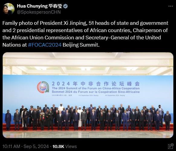 中國(guó)外交部發(fā)言人華春瑩5日在社交平臺(tái)上發(fā)布了一張中非合作論壇峰會(huì)全家福照片,并配文寫道:“習(xí)近平主席與51位非洲國(guó)家元首和政府首腦、2位總統(tǒng)代表、非盟委員會(huì)主席和聯(lián)合國(guó)秘書長(zhǎng)在2024年中非合作論壇北京峰會(huì)合影?!?/p>