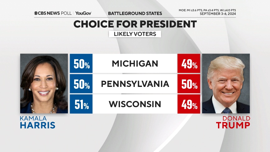 本月初,哥倫比亞廣播公司(CBS)與民調(diào)公司聯(lián)合進(jìn)行的最新民調(diào)結(jié)果顯示,在密歇根州、賓夕法尼亞州和威斯康星州這3個(gè)關(guān)鍵州,哈里斯和特朗普的支持率分別為50%對(duì)49%、50%對(duì)50%、51%對(duì)49%。
