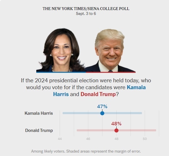《紐約時(shí)報(bào)》和錫耶納學(xué)院8日公布的最新民調(diào)也顯示,特朗普的支持率(48%)僅領(lǐng)先哈里斯(47%)一個(gè)百分點(diǎn),在誤差范圍內(nèi),雙方勢(shì)均力敵。