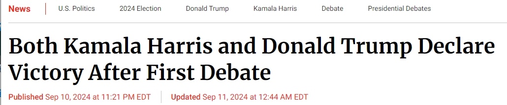 美媒報(bào)道稱(chēng),在辯論結(jié)束后,哈里斯和特朗普均宣布自己是“贏家”。哈里斯競(jìng)選團(tuán)隊(duì)表示,“哈里斯是今晚唯一的獲勝者”。特朗普也在社交平臺(tái)上連發(fā)多條消息慶祝勝利,稱(chēng)“這是他有史以來(lái)最棒的一次辯論”。