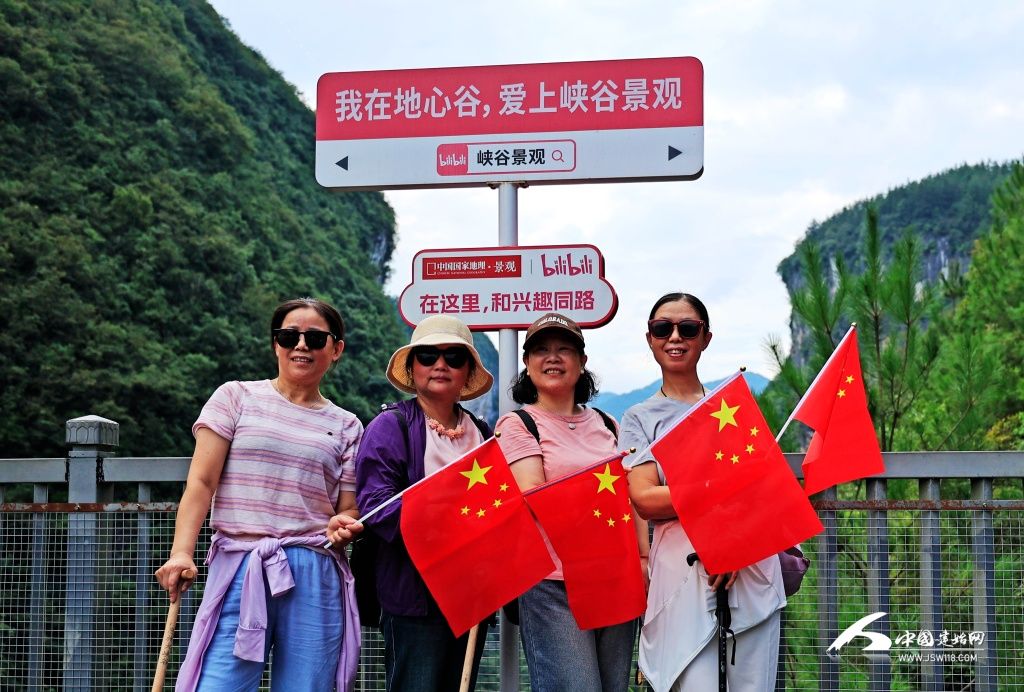金秋時節(jié)的地心谷,青翠的松和五彩的落葉林交織相間,構(gòu)成五彩斑斕的畫卷。此刻,處處紅旗招展,游人可手拿國旗登山游覽、打卡留念,在金色的陽光下愜意游玩,樂享假日時光。
