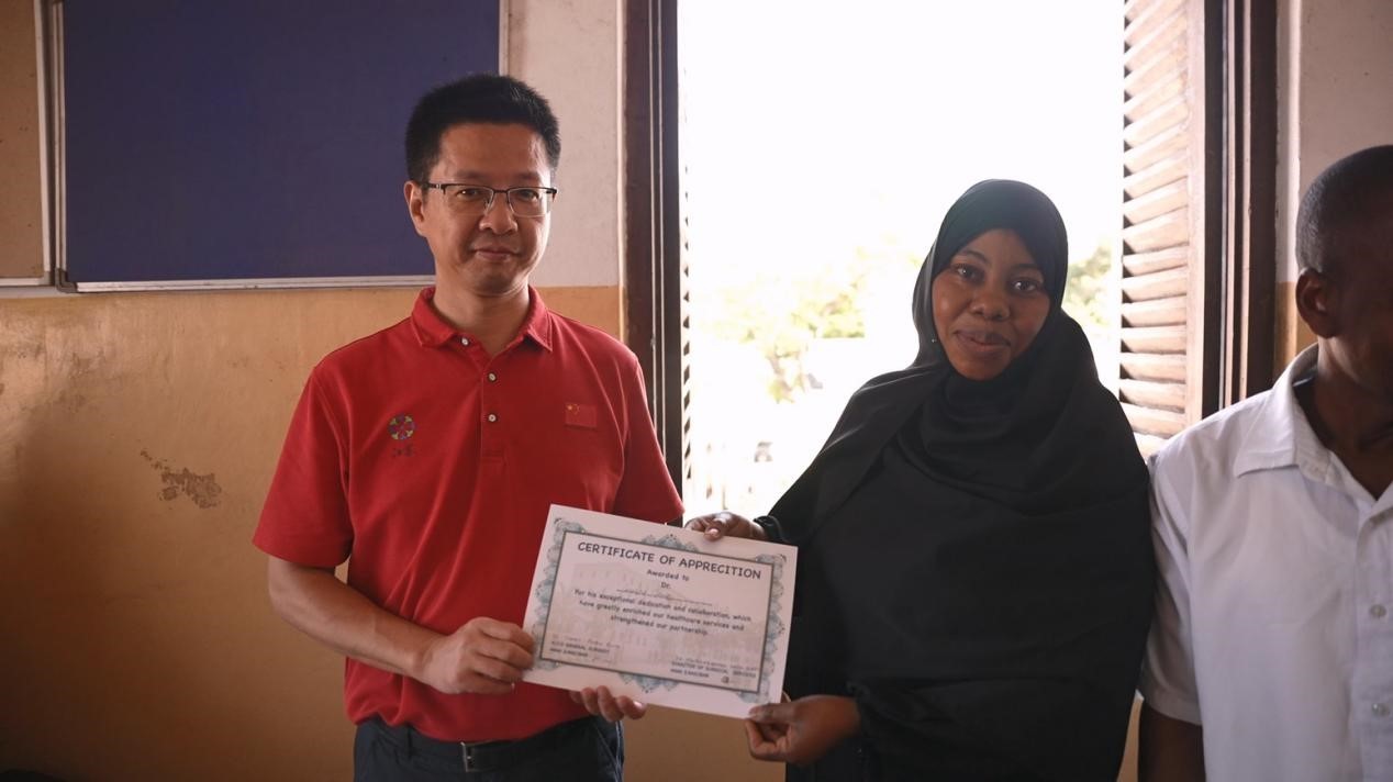 大外科主任姆瓦娜給隊(duì)長(zhǎng)蔣國(guó)慶(左一)頒發(fā)感謝狀。中國(guó)援桑醫(yī)療隊(duì)供圖