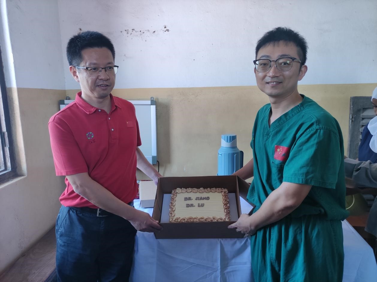 活動(dòng)結(jié)束時(shí),大外科主任姆瓦娜給醫(yī)療隊(duì)隊(duì)長(zhǎng)蔣國(guó)慶和隊(duì)員盧圣銘、高玲玲以及王正東頒發(fā)了感謝狀、紀(jì)念品,并與參會(huì)人員一起品嘗了定制的寫有隊(duì)員姓名的蛋糕。