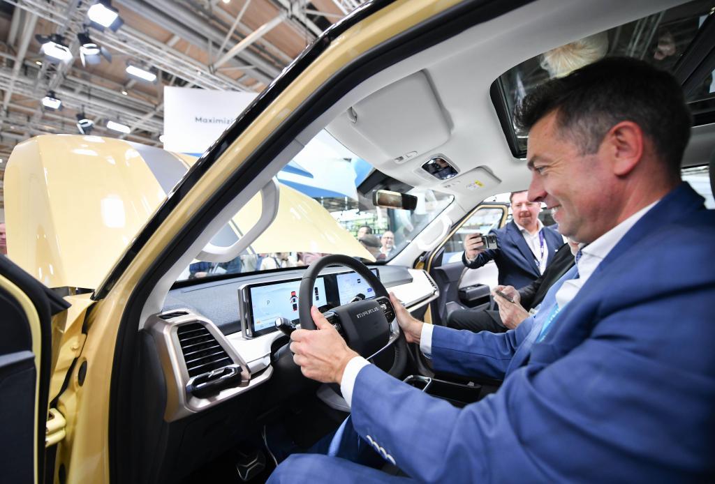 9月16日,在德國漢諾威國際交通運輸博覽會媒體預展上,一名男子體驗上汽大通eTerron 9純電皮卡車。新華社記者任鵬飛攝