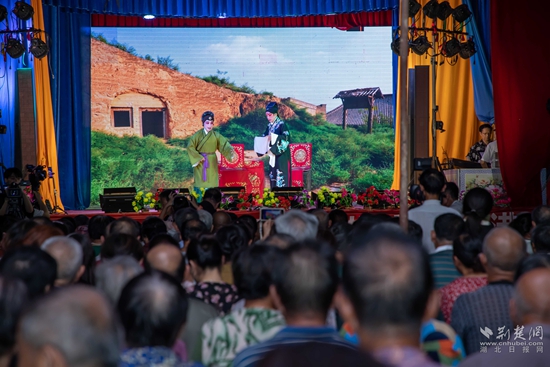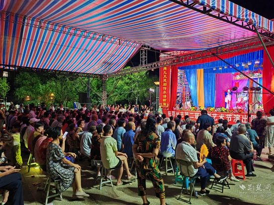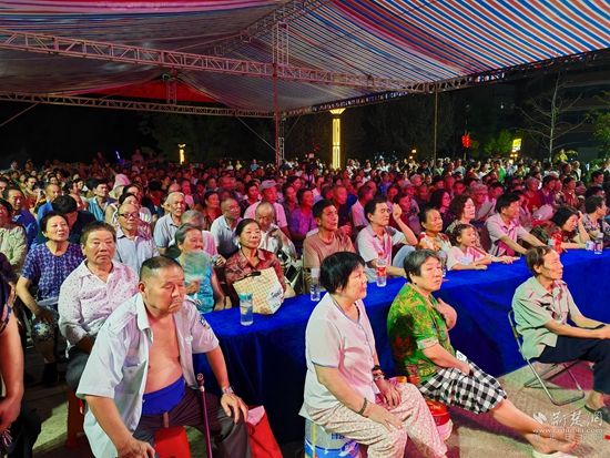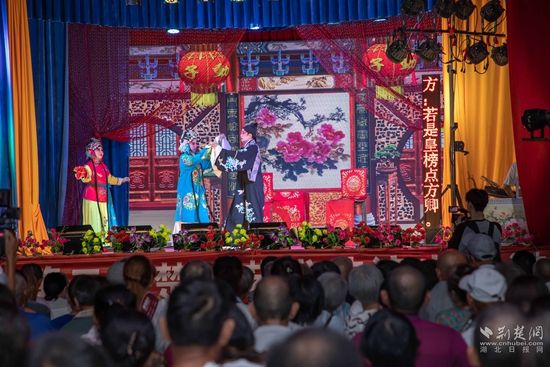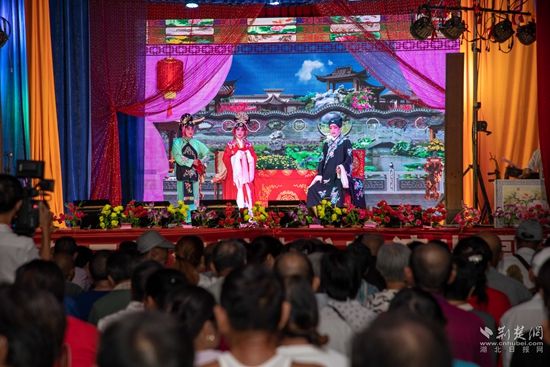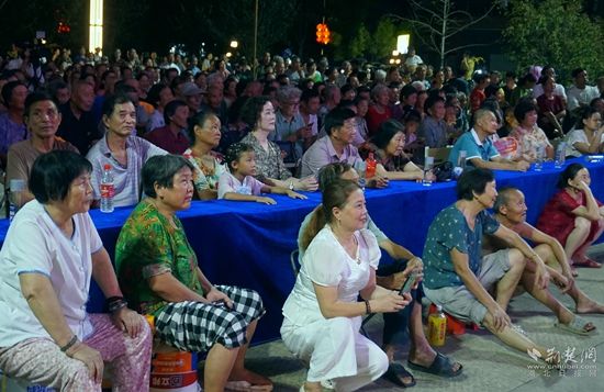 當(dāng)晚7點(diǎn),廣場上人聲鼎沸、鑼鼓喧天、座無虛席,來自周邊村鎮(zhèn)的老百姓偕老扶幼聚集于此,共襄楚劇盛會。