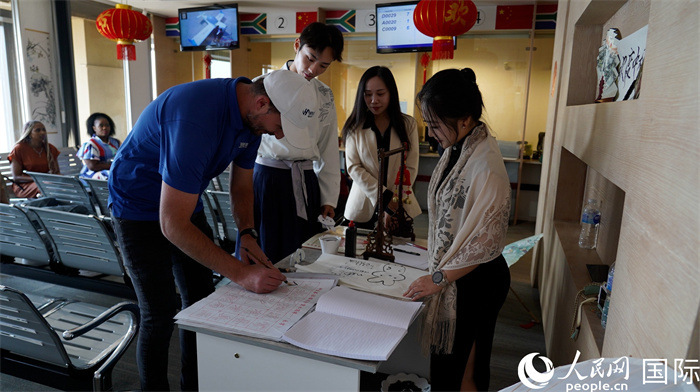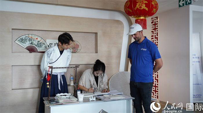 遞簽來賓興致勃勃地體驗中國書法。人民網(wǎng) 劉暢攝