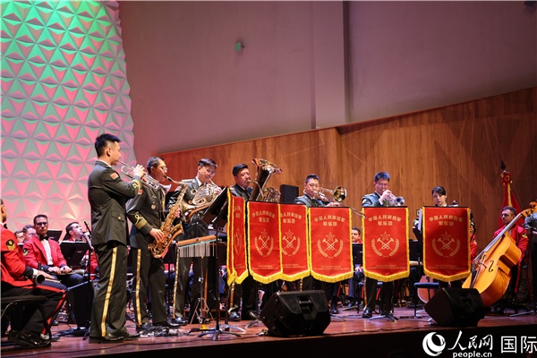 巴西海軍陸戰(zhàn)隊(duì)軍樂團(tuán)、中國人民解放軍軍樂團(tuán)演出分隊(duì)部分隊(duì)員同臺(tái)演出。人民網(wǎng)記者 時(shí)元皓攝