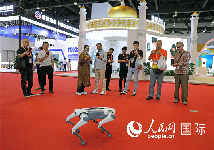 東博會(huì)上,觀眾正在參觀一只機(jī)器狗。綠色能源、新能源汽車、綠色農(nóng)產(chǎn)品等成為本屆東博會(huì)觀眾關(guān)注的焦點(diǎn)。人民網(wǎng)記者 趙益普攝