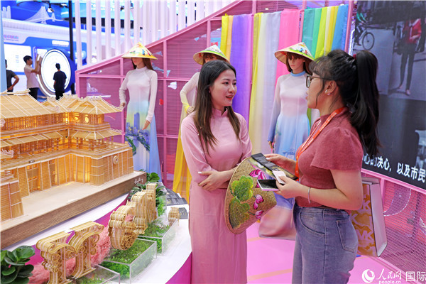 參觀者在東博會越南展區(qū)同工作人員咨詢交談。人民網(wǎng)記者 趙益普攝