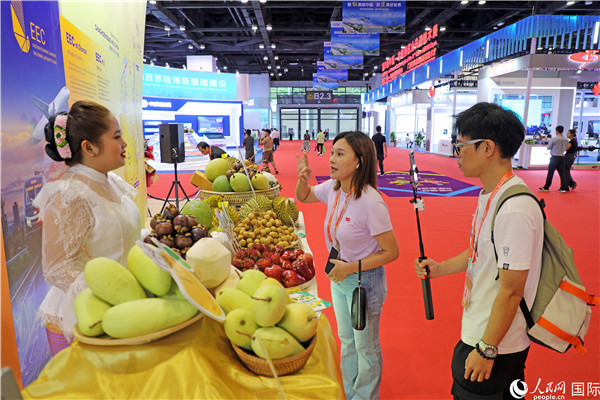 在東博會泰國展區(qū),參觀者在向泰方工作人員了解泰國水果情況。人民網(wǎng)記者 趙益普攝