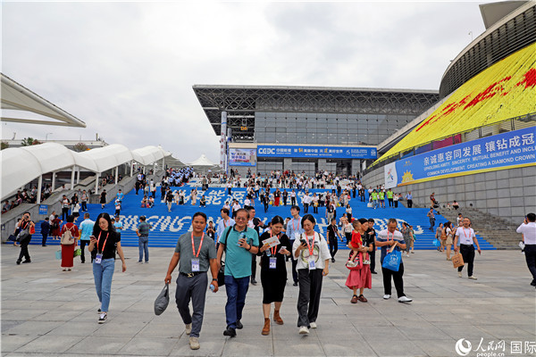 第二十一屆東博會展館外,參觀者步行離場。人民網(wǎng)記者 趙益普攝