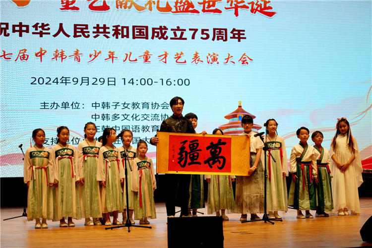 人民網(wǎng)首爾9月30日電 (記者莽九晨)由中韓子女教育協(xié)會(huì)、中韓多文化交流協(xié)會(huì)、在韓中國(guó)語(yǔ)教育協(xié)會(huì)聯(lián)合舉辦的慶祝中華人民共和國(guó)成立75周年暨第七屆中韓青少年兒童才藝表演大會(huì)29日在韓國(guó)仁川市舉行,在韓華僑華人及子女700余人參加,中國(guó)駐韓國(guó)大使館臨時(shí)代辦方坤應(yīng)邀出席。