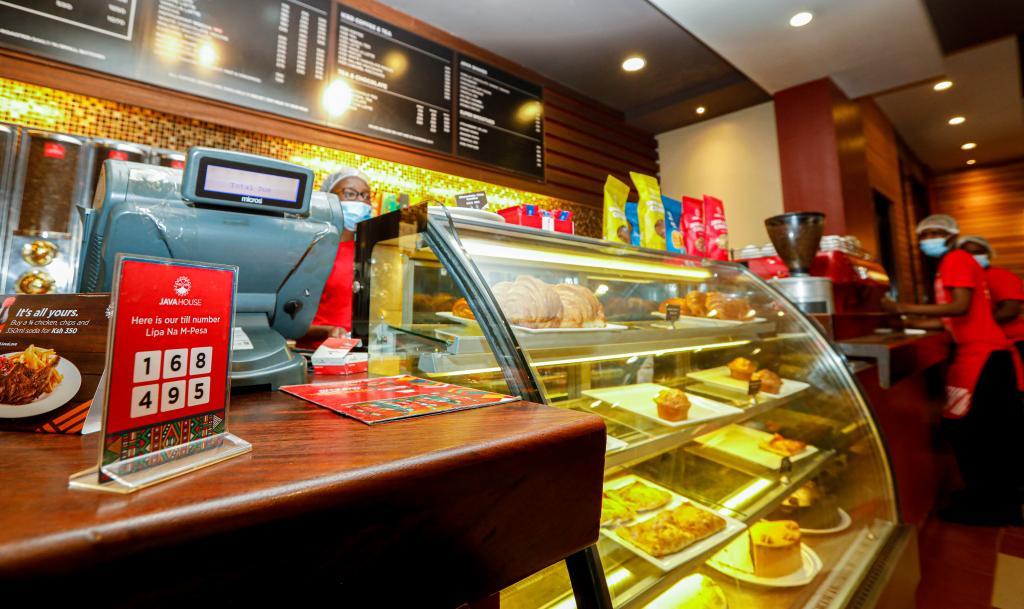 2021年9月16日,肯尼亞首都內(nèi)羅畢市中心一家咖啡店的收銀臺擺放著M-Pesa支付相關(guān)信息。新華社記者張宇攝